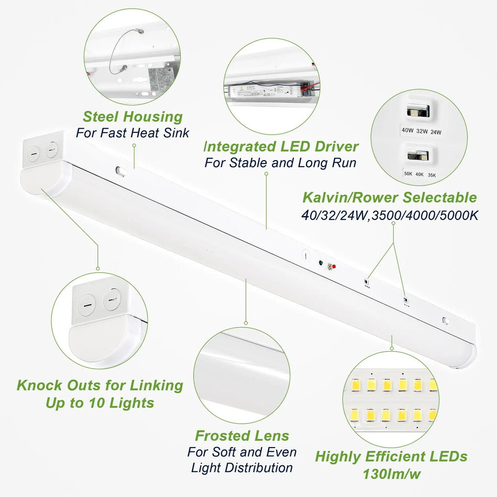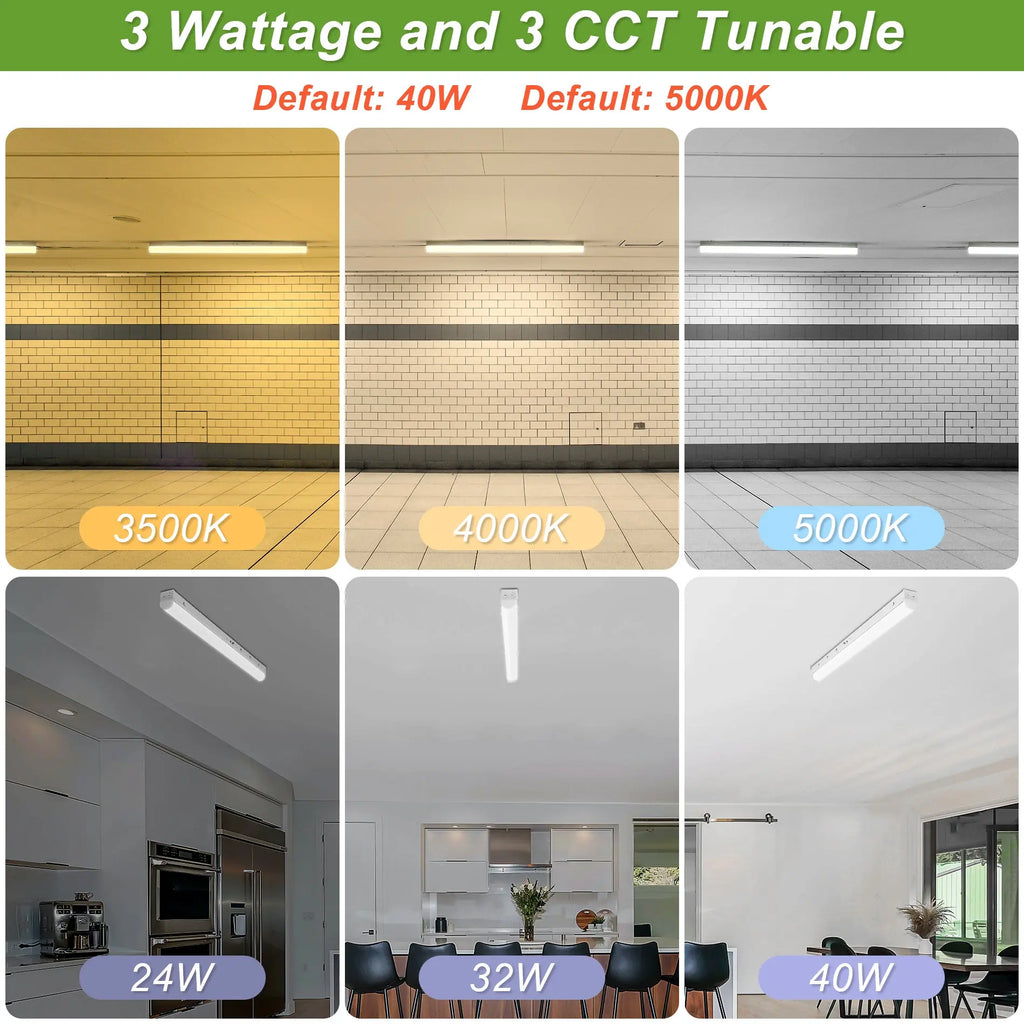 The TANLITE 4-Pack 4FT Linkable LED Linear Strip Light is designed for bright, energy-efficient, and flexible lighting in commercial and residential spaces. Each 40W fixture delivers 5,200 lumens of crisp illumination and allows you to select from 3500K, 4000K, or 5000K color temperatures to match your environment.